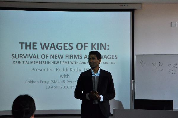 2016年4月18日下午,第三期创业研究工作坊在国际工商管理学院108举行。新加坡管理大学(SMU)Reddi Kotha副教授做客我校,并进行了以Wages of Kin: Survivaland Wages of Founder and Initial Employees in New Firms为题做了主体讲座。我校创业研究教师与博士研究生参与了此次讲座并与Reddi Kotha副教授进行了深入的交流和探讨。