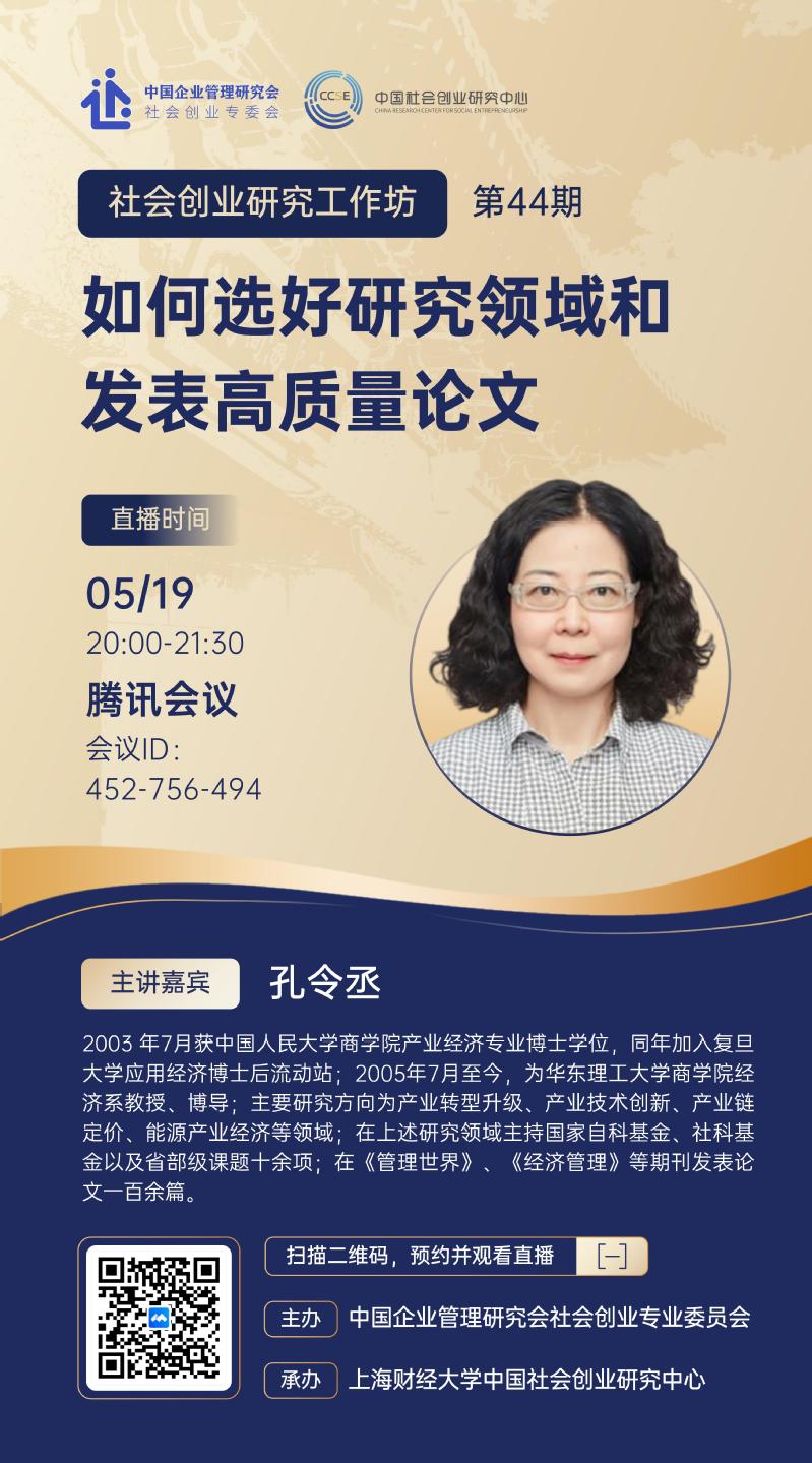 2022年5月19日,邀请到华东理工大学商学院教授孔令丞做客第44期社会创业研究工作坊,在线分享研究者如何选择研究领域和发表高质量论文。
