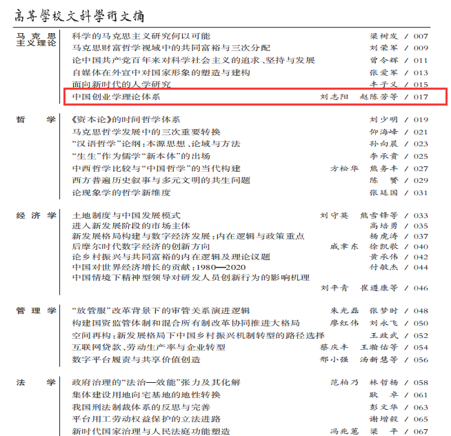 我中心刘志阳主任和赵陈芳研究员合作撰写的论文《中国创业学理论体系》被《高等学校文科学术文摘》收录发表在2022年第2期。